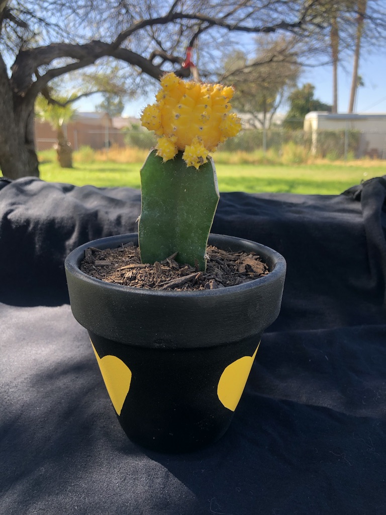 This cute yellow-top cacti in the yellow heart black planter is ready to come grow in your home!
