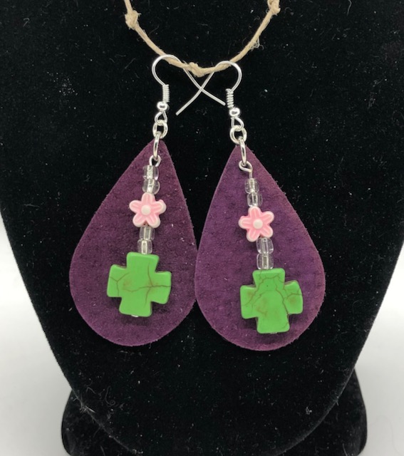 Purple Leather Teardrop Green Cross and Pink Flower Earrings